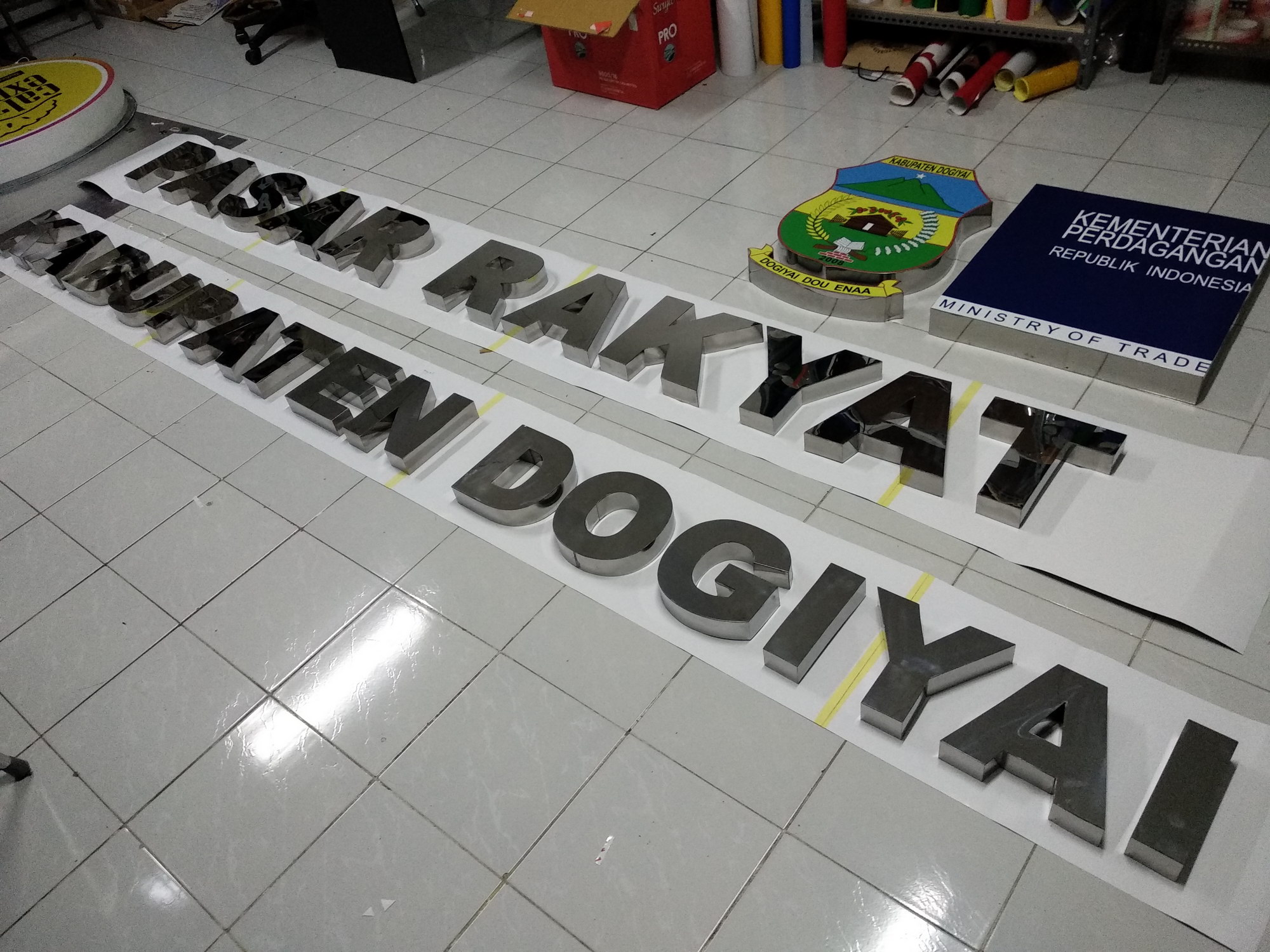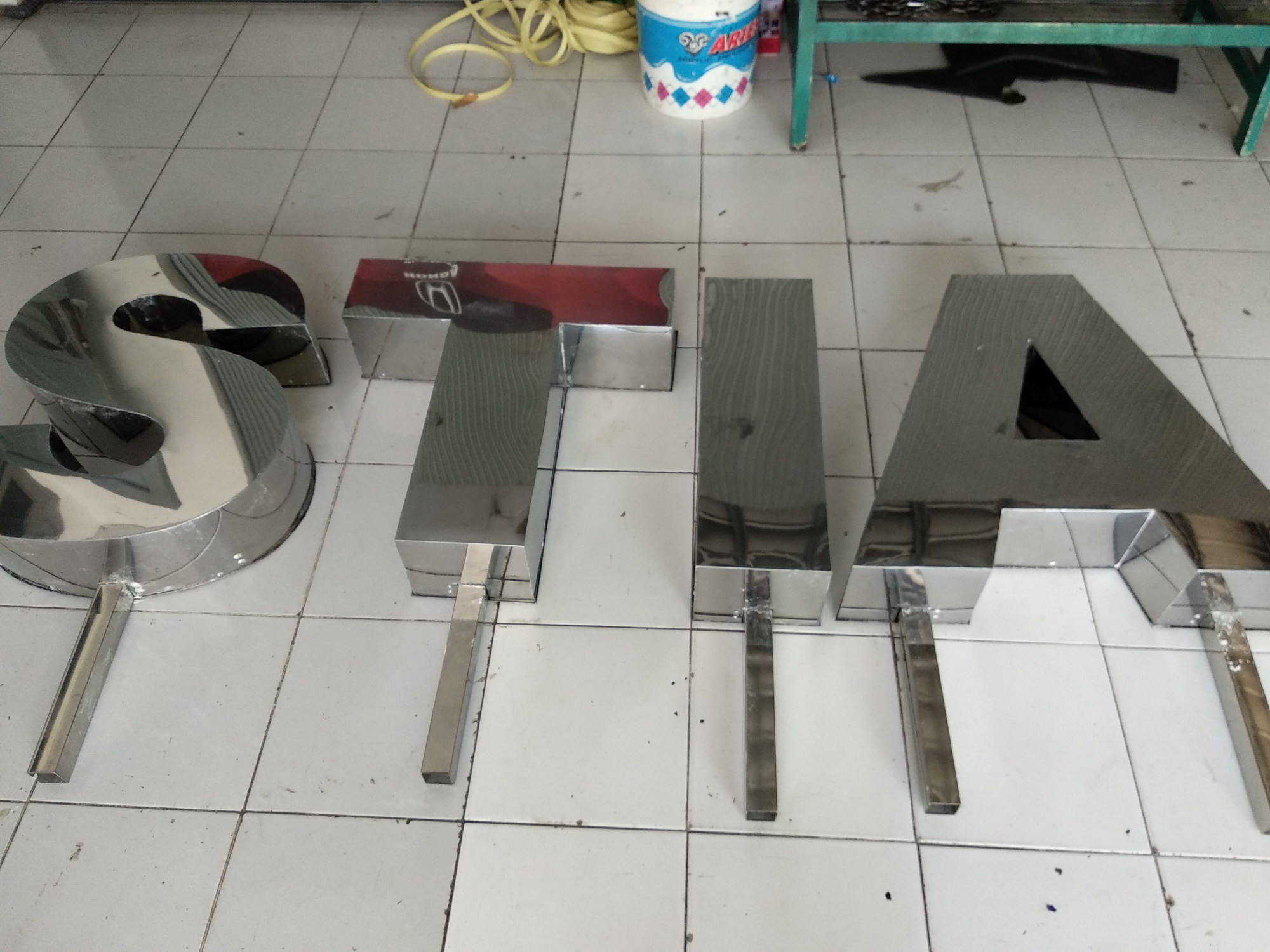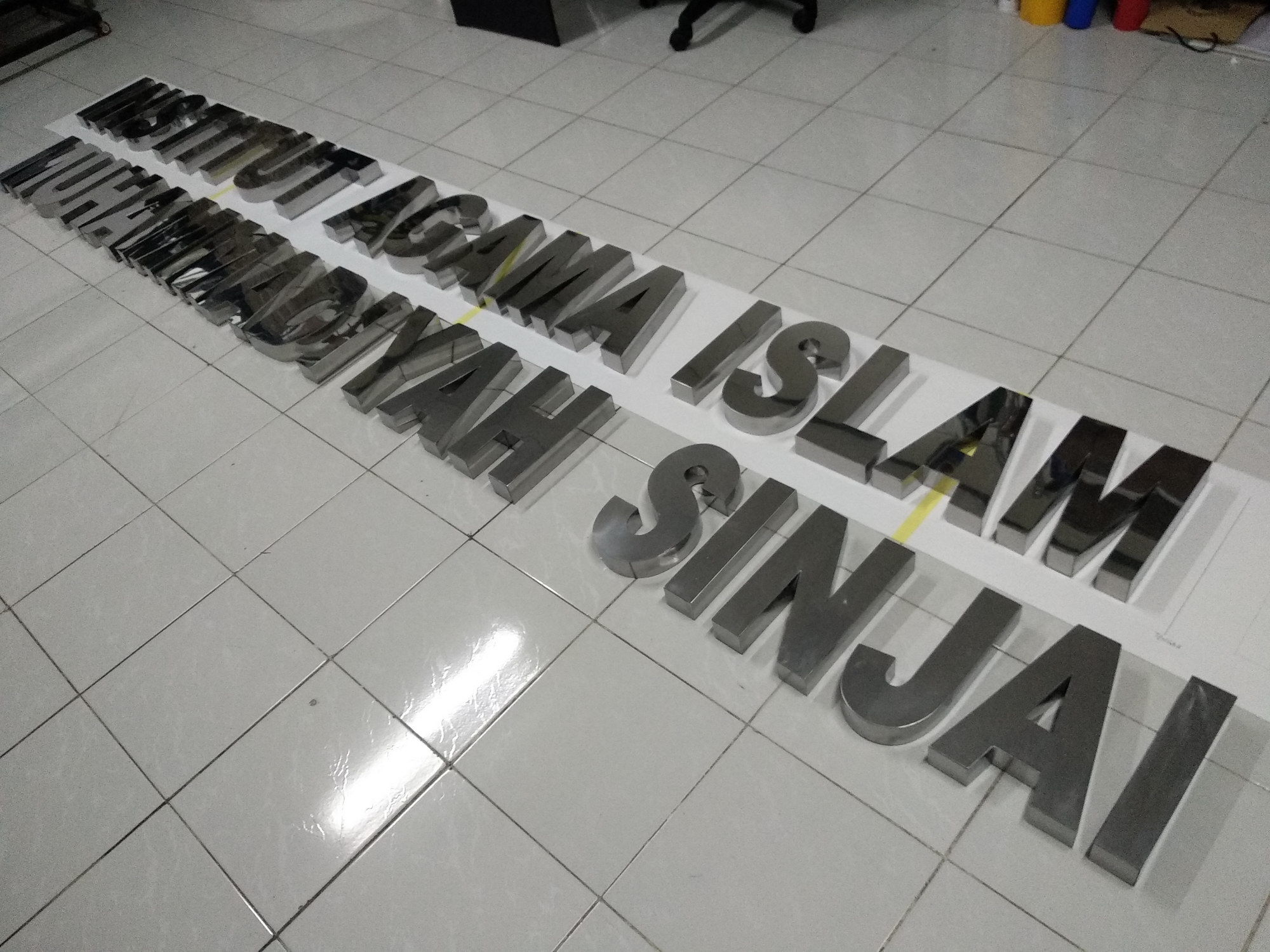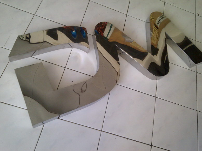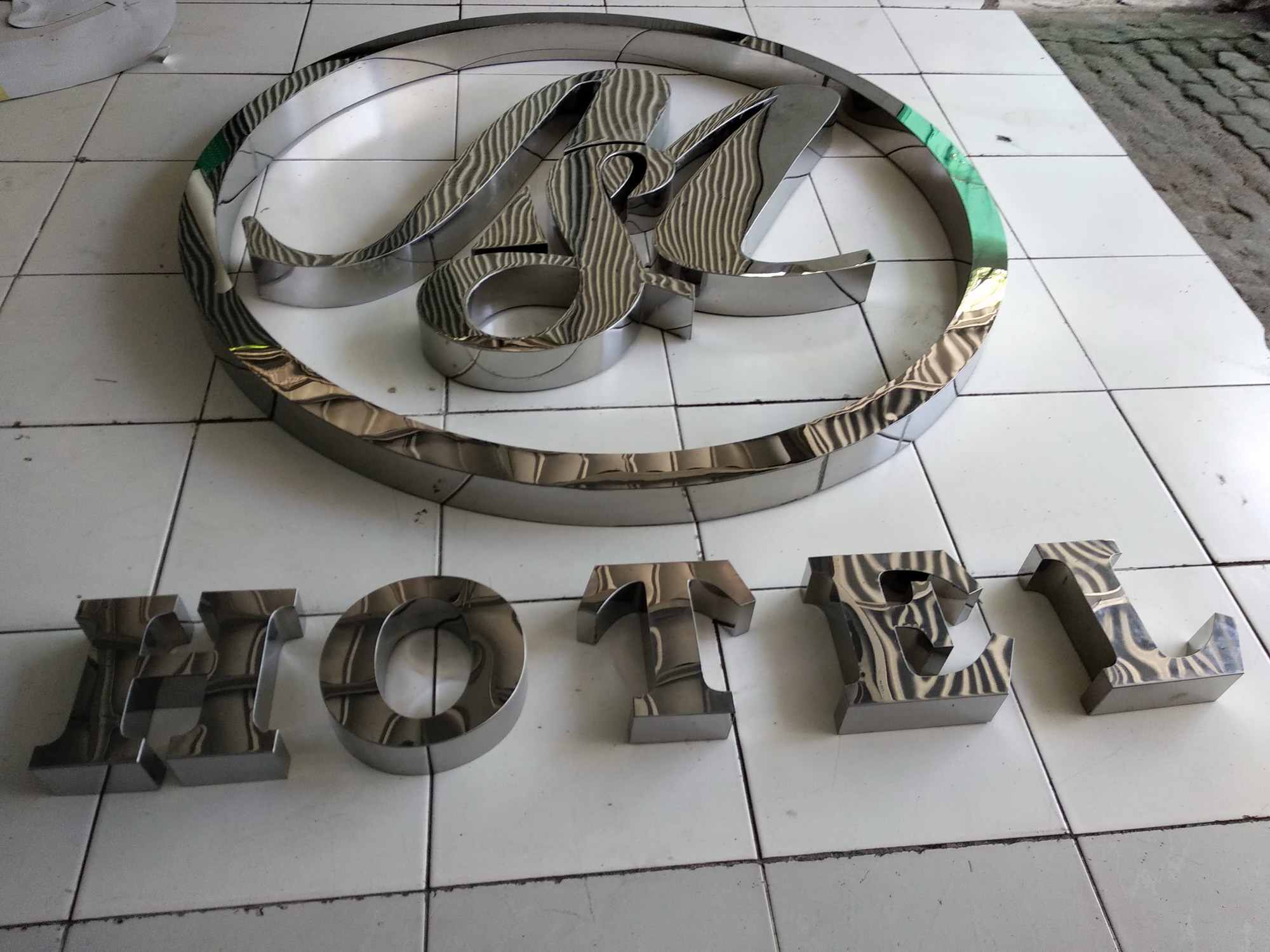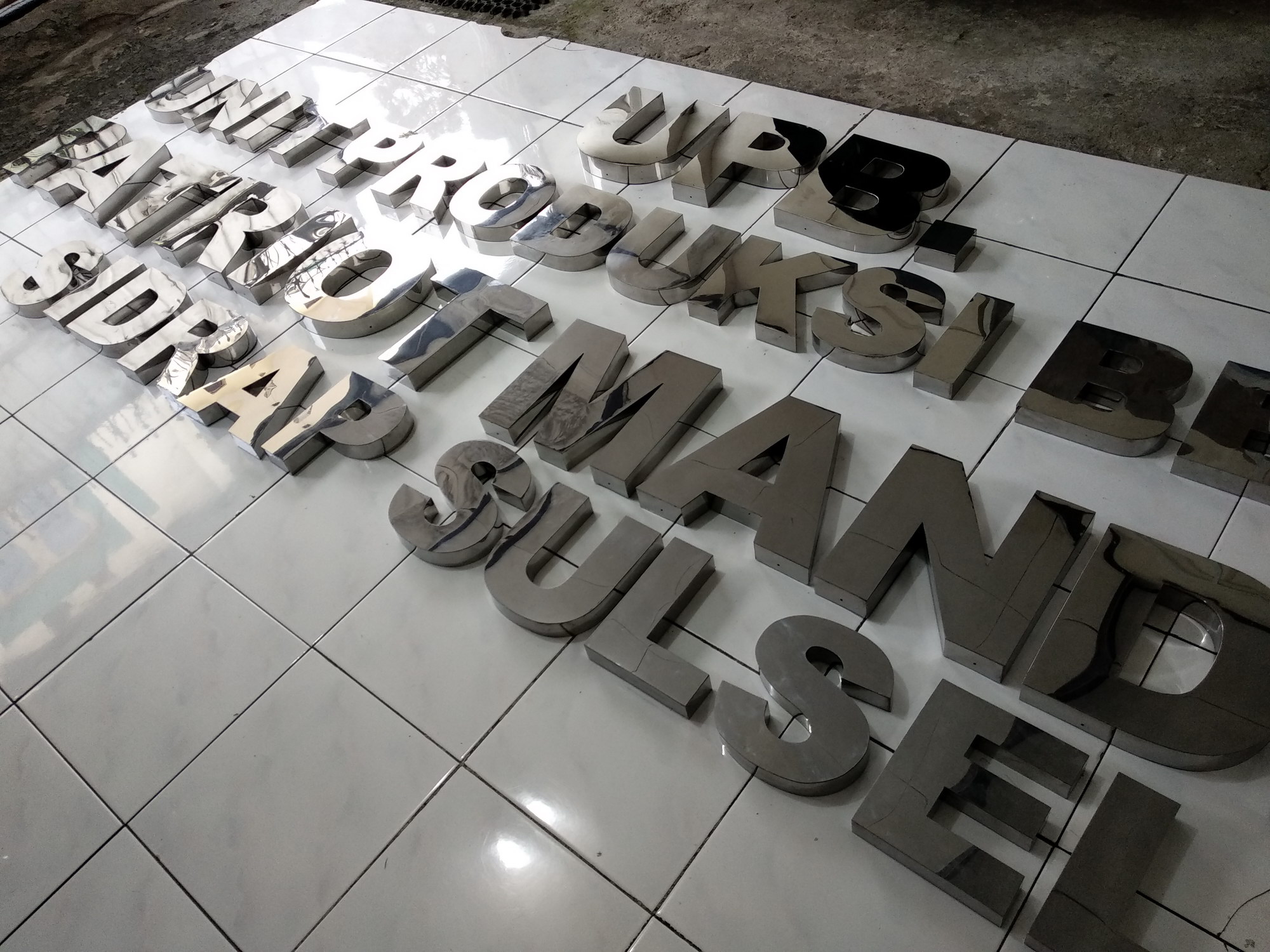 Huruf timbul full stainless Steel (diberi finishing poles untuk agar mengkilat)