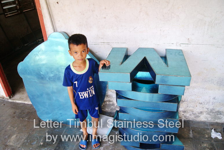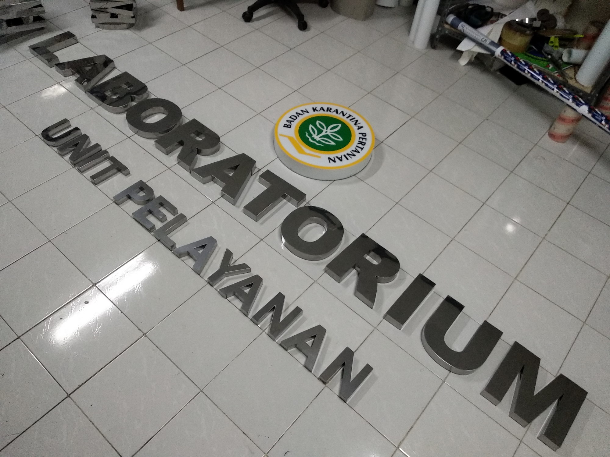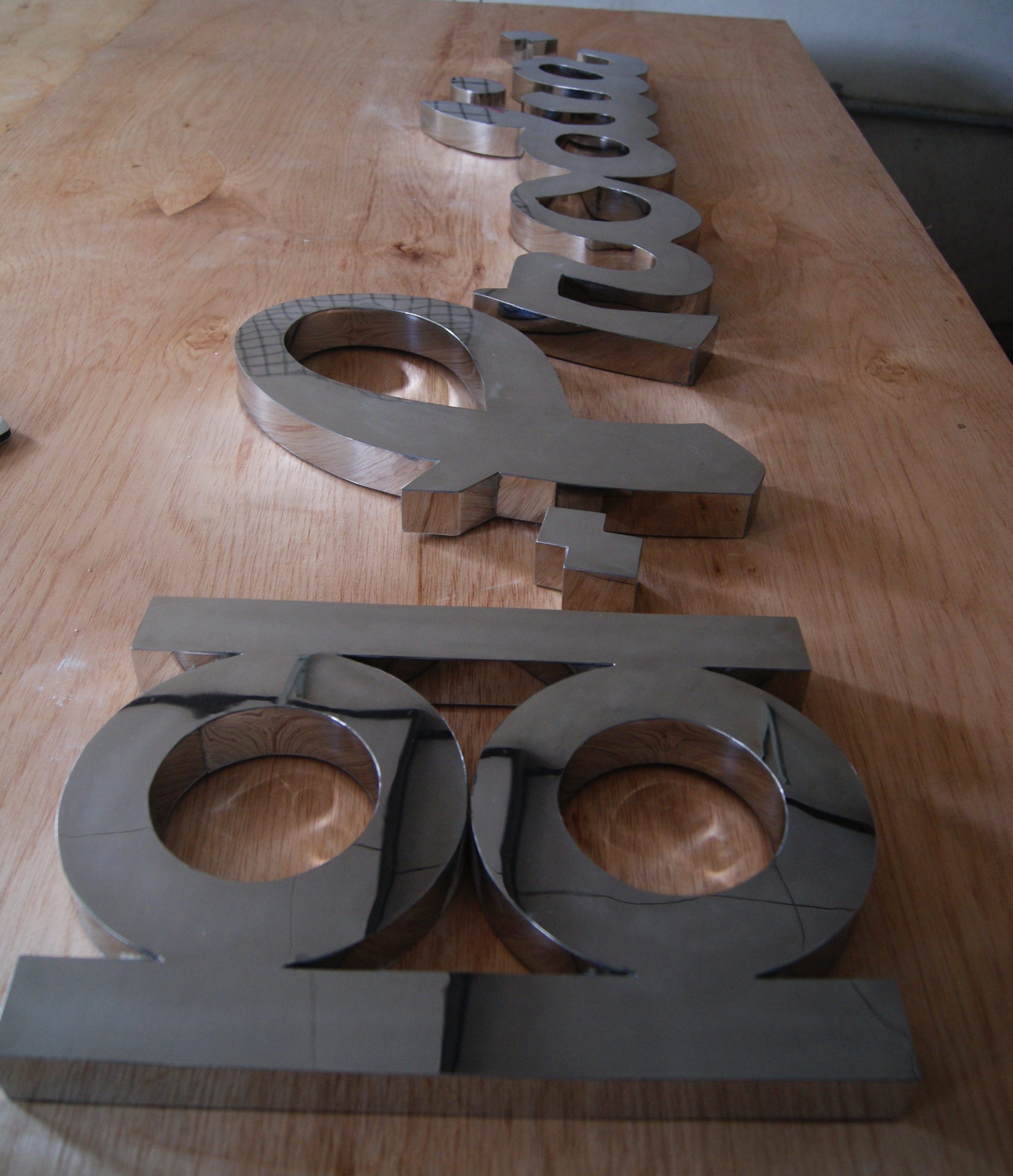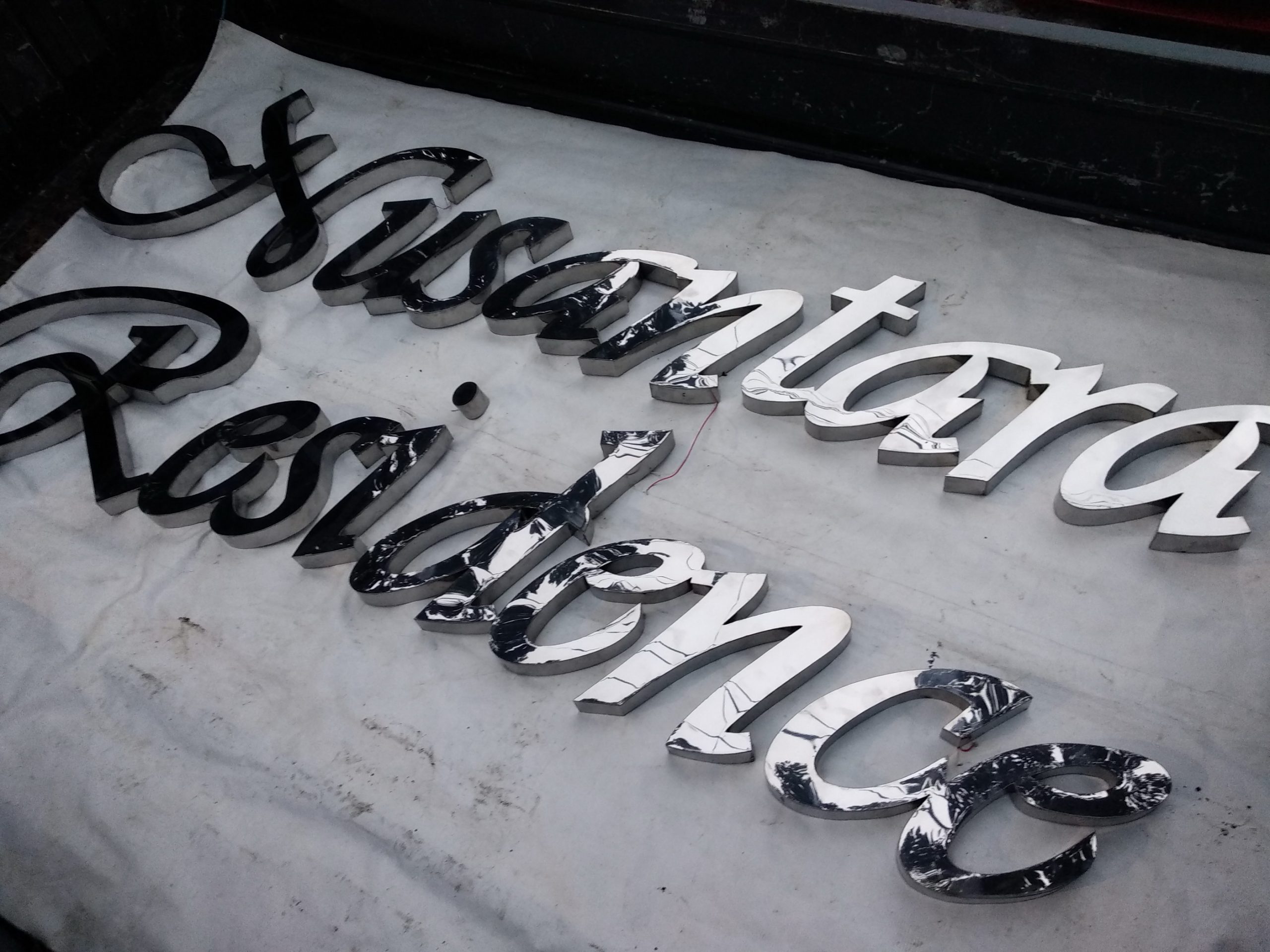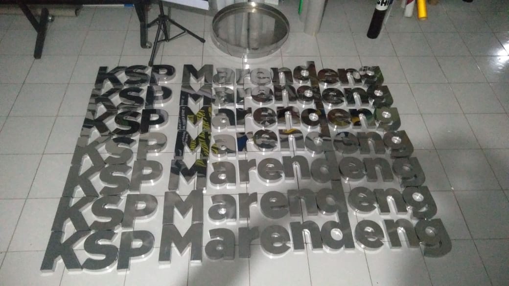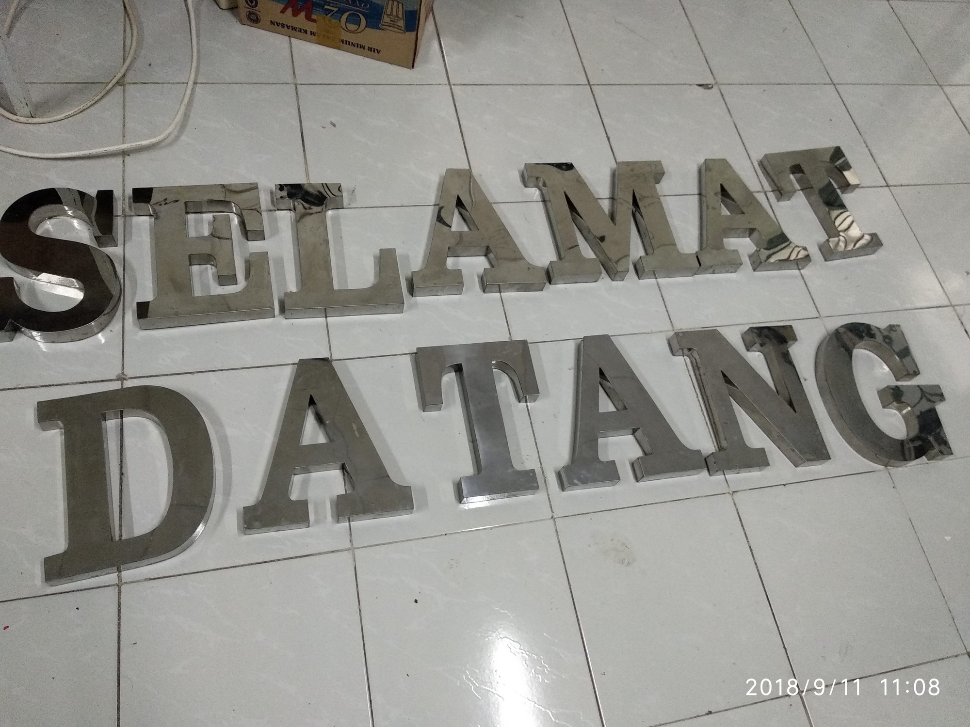 Huruf timbul full stainless Steel (diberi finishing poles untuk agar mengkilat)