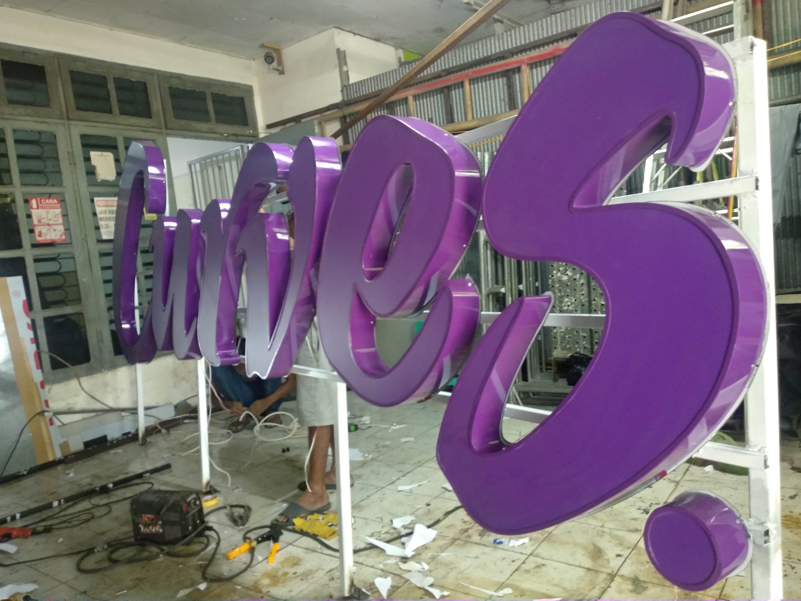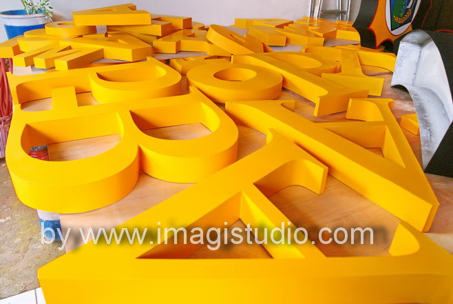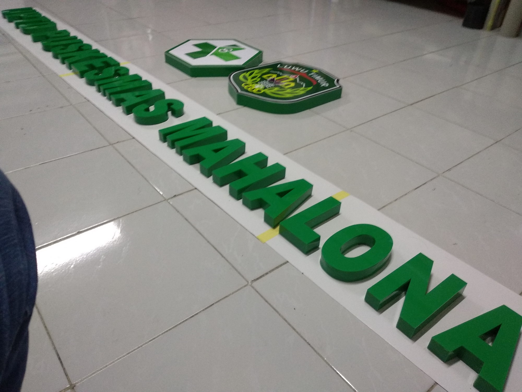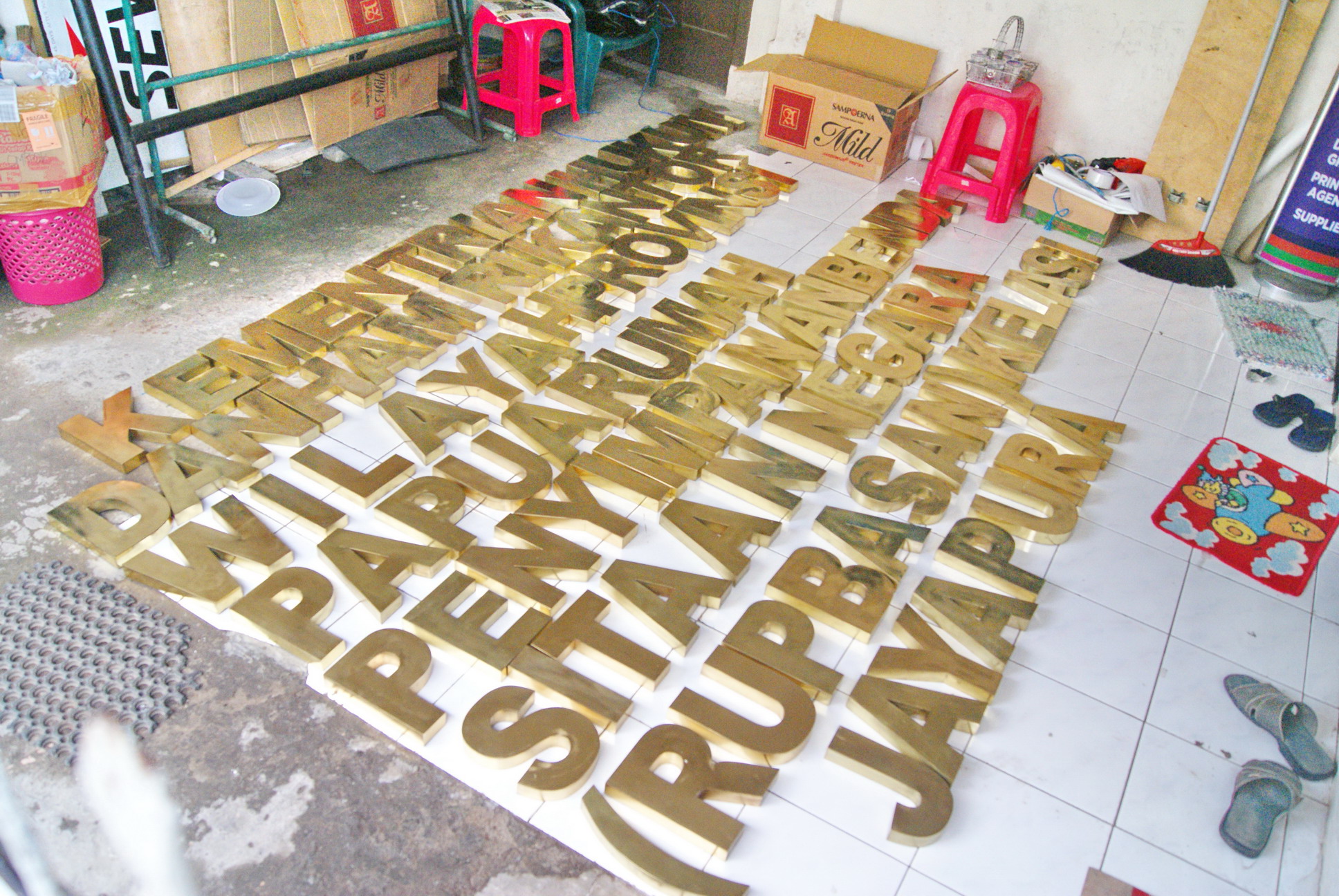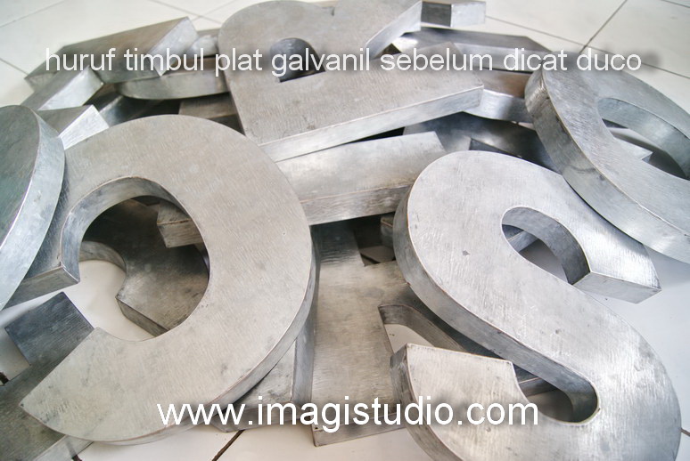 Huruf timbul full Seng Galvanis (diberi finishing cat duco untuk pewarnaan)