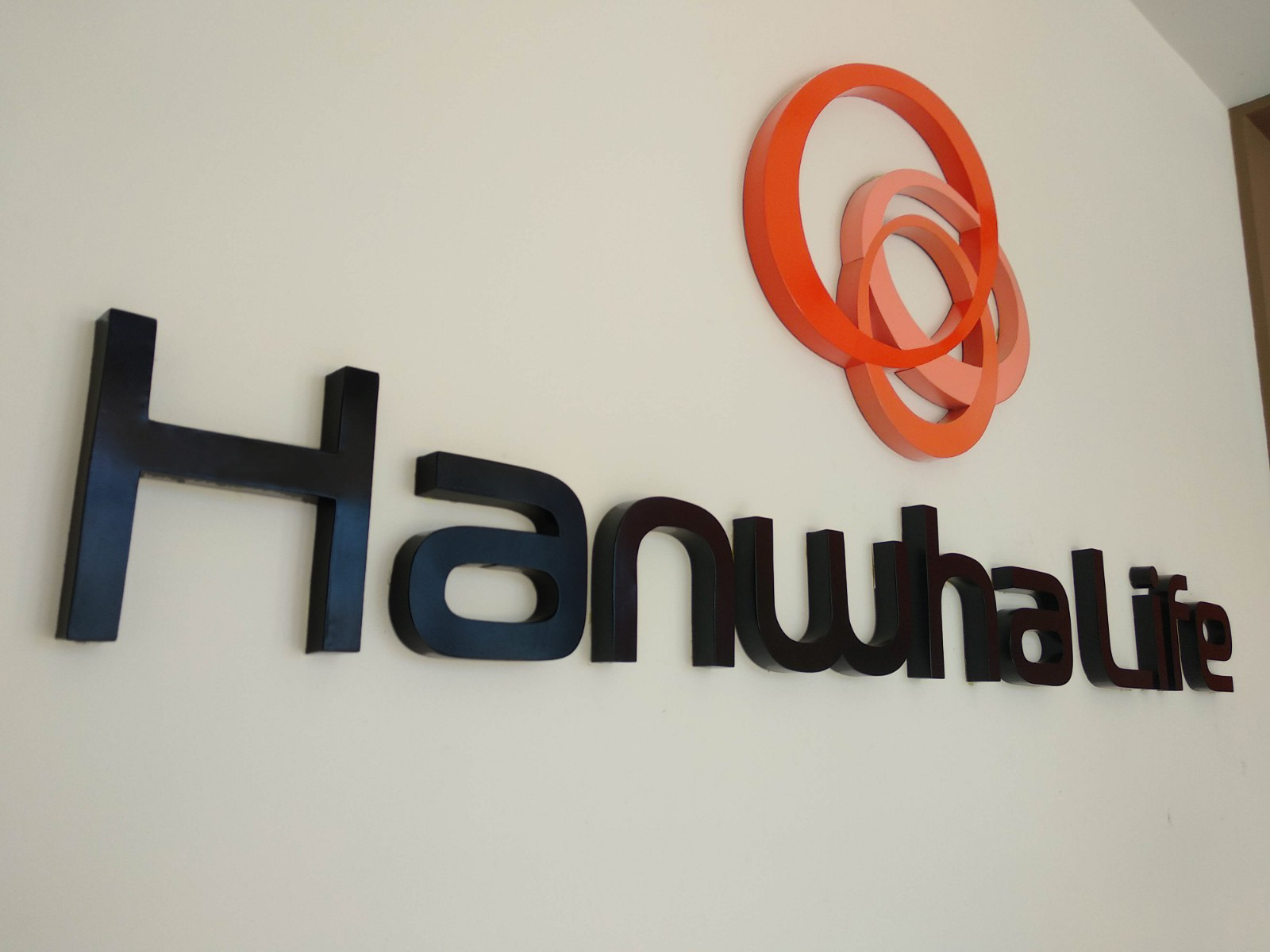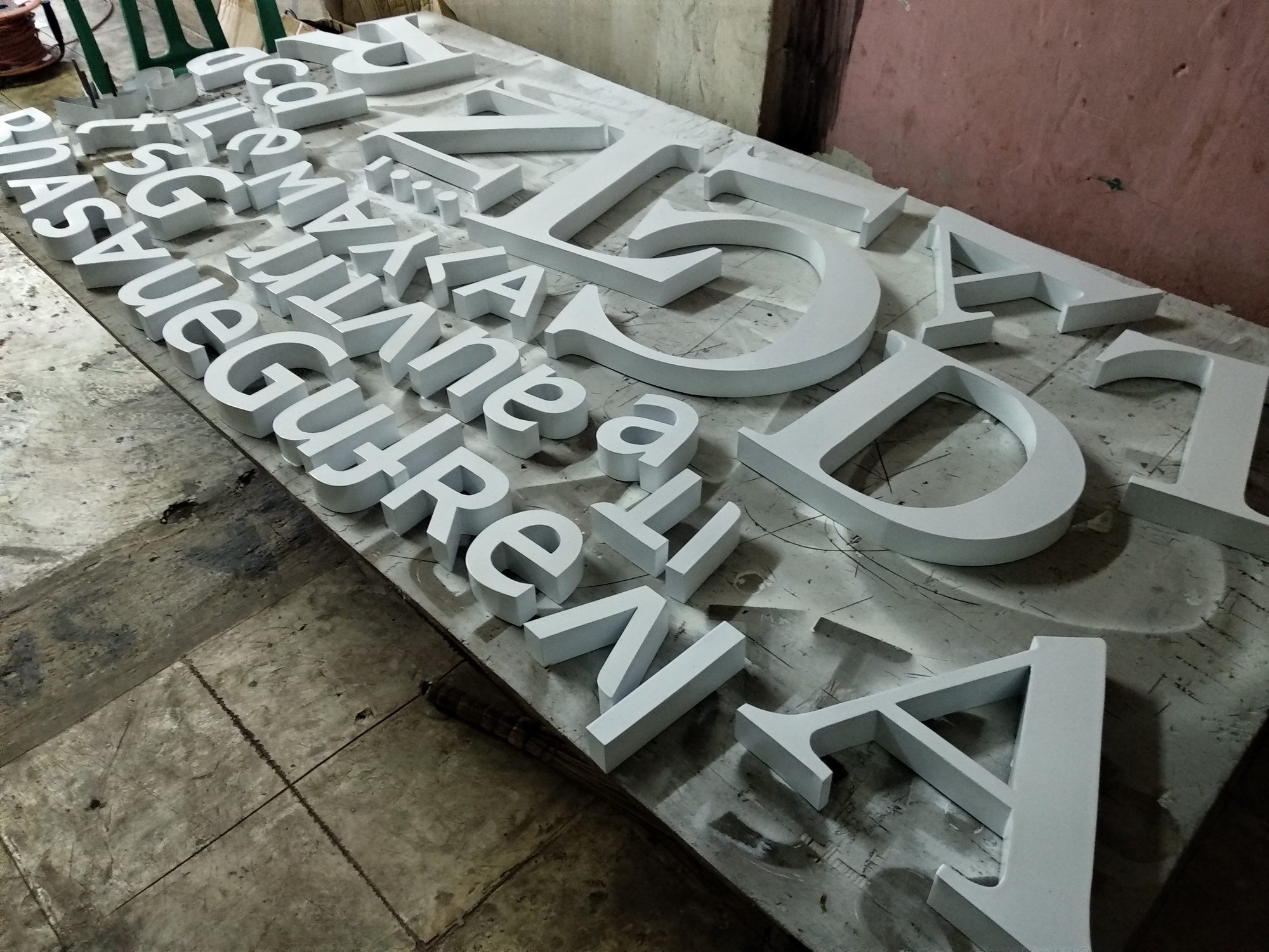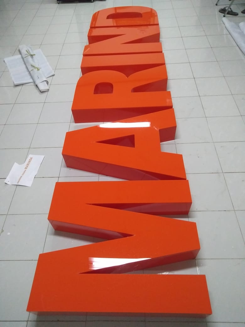 Huruf timbul full Seng Galvanis (diberi finishing cat duco untuk pewarnaan)