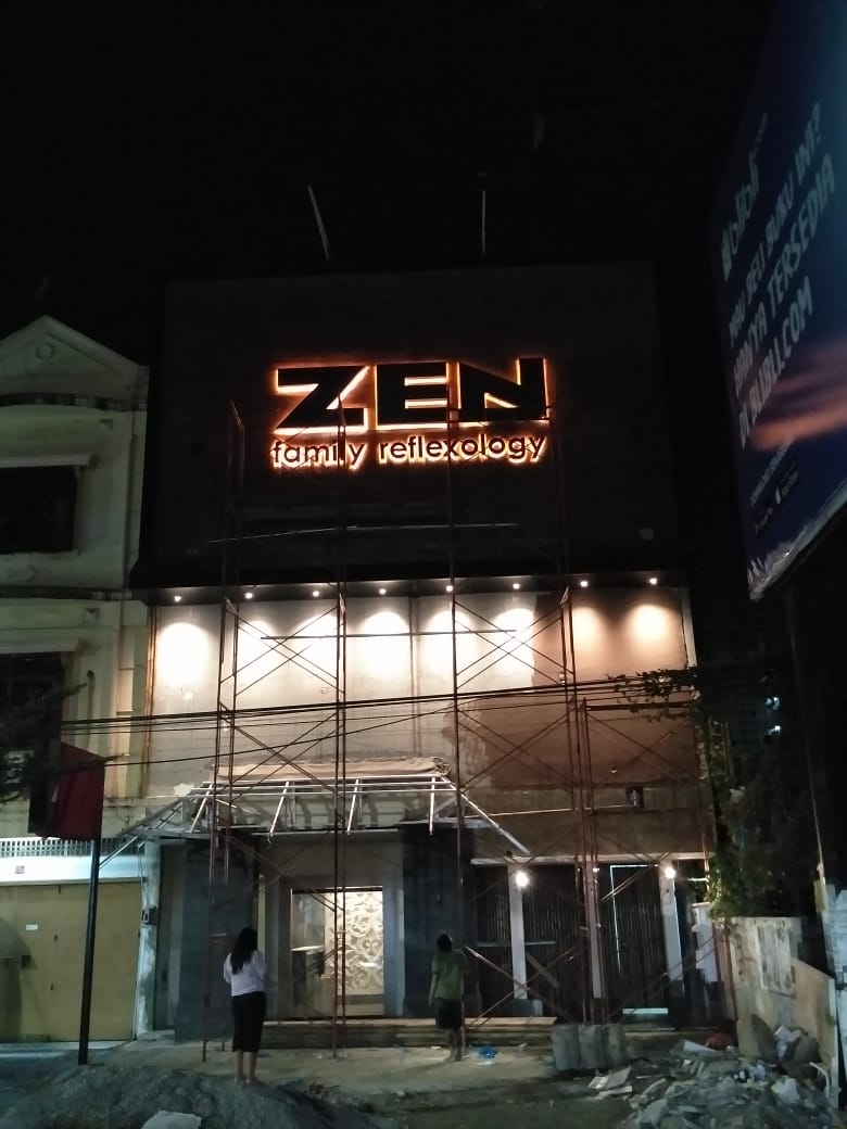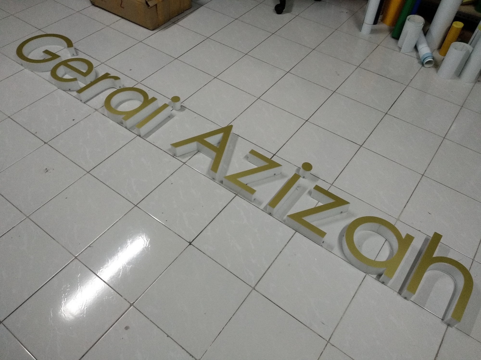 Huruf timbul kombinasi depan akrilik, bagian ketebalan menggunakan stainless atau seng / galvanis.