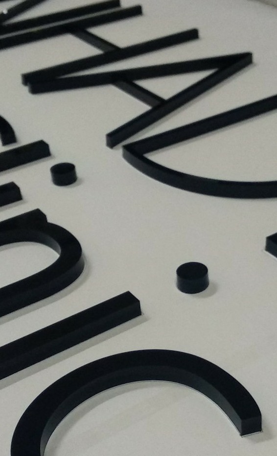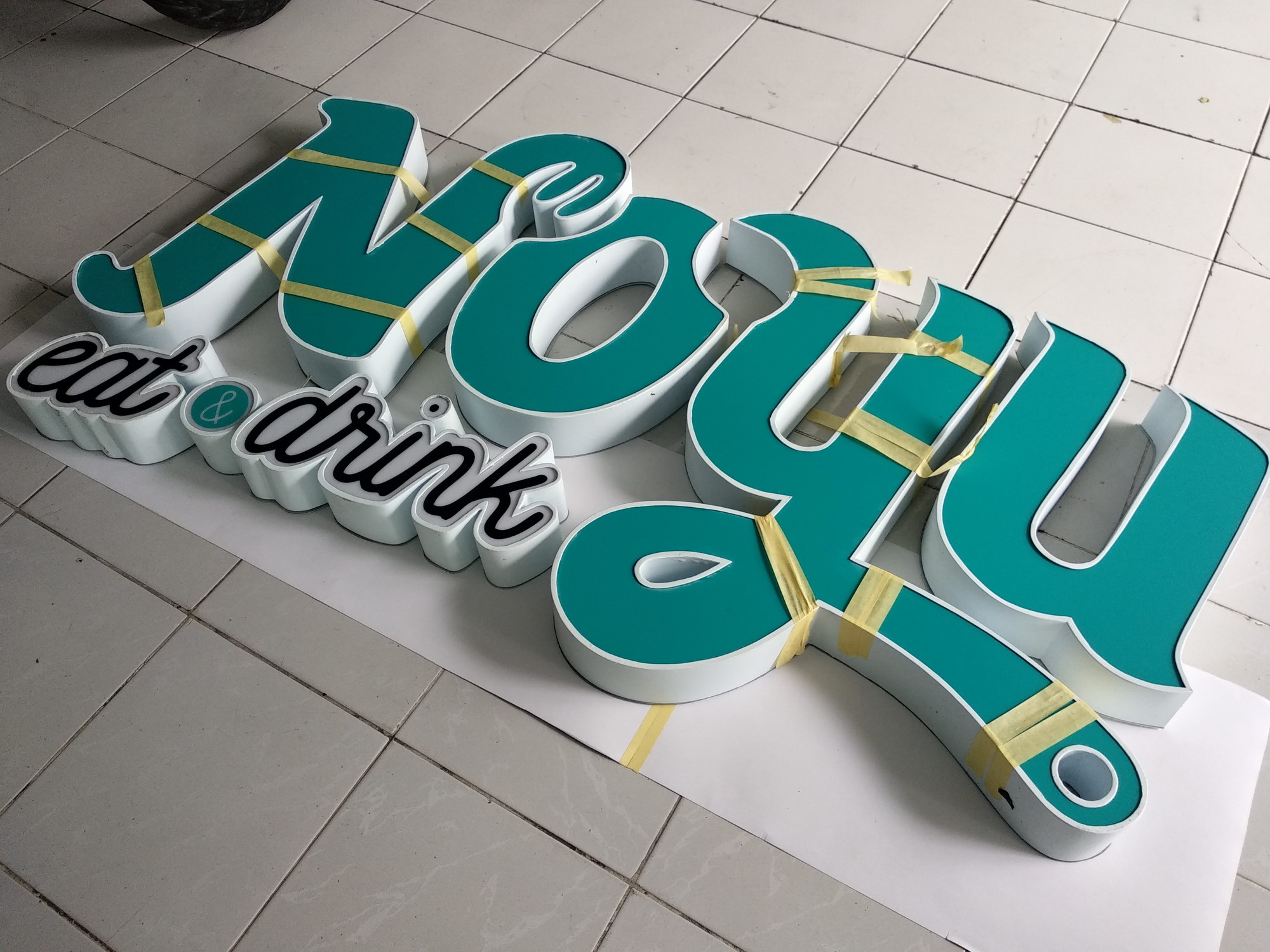 Huruf timbul full plat akrilik putih susu (biasanya diberi stiker bila ingin berwarna)
