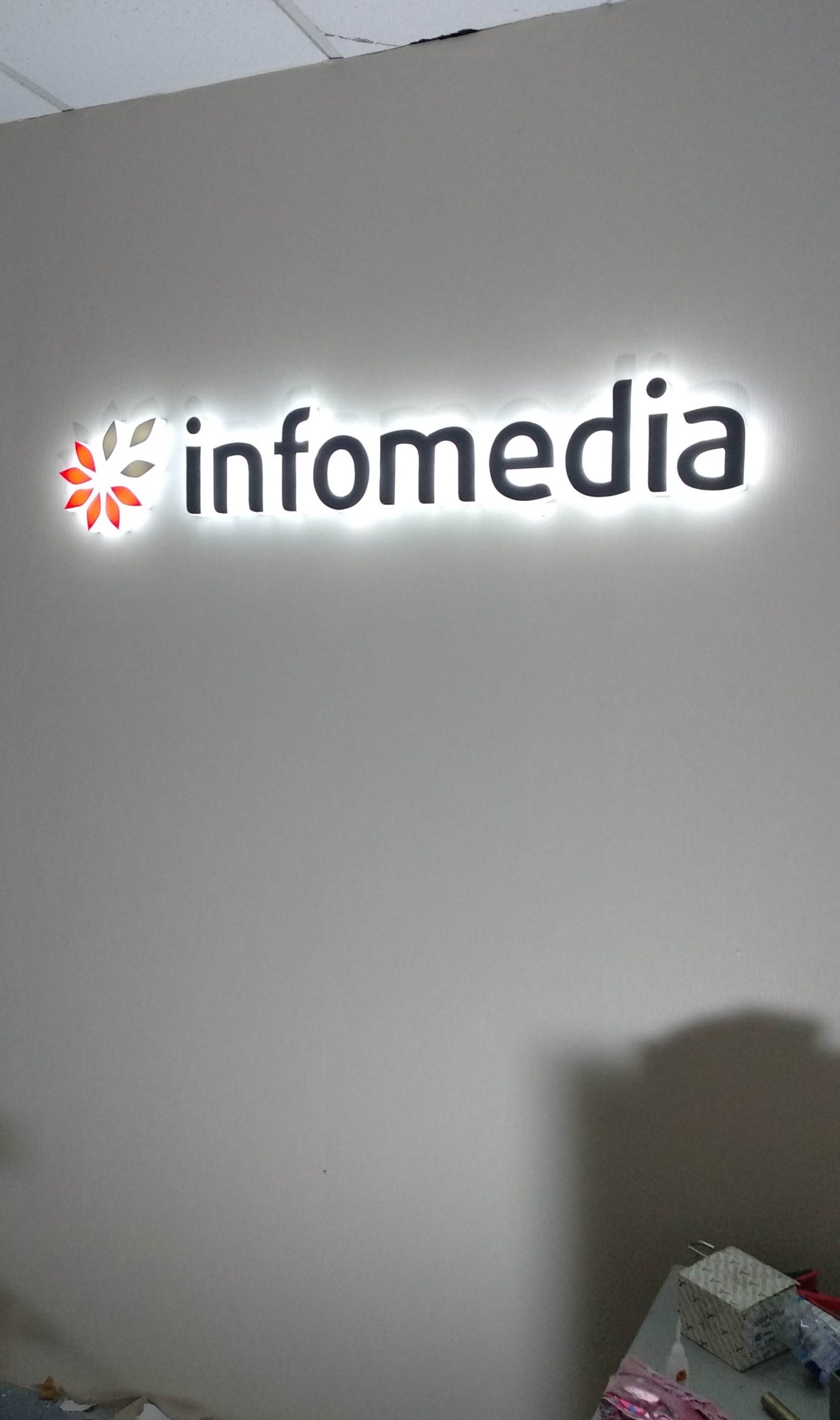 Huruf Akrilik Menyala Indoor menempel Infomedia gedung Graha Pena Makassar