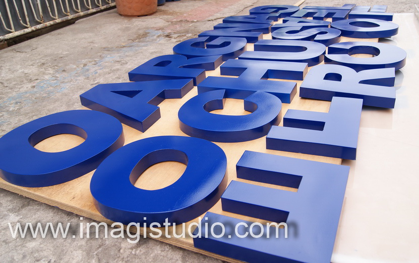 Huruf timbul full Seng Biasa (diberi finishing cat duco untuk pewarnaan)