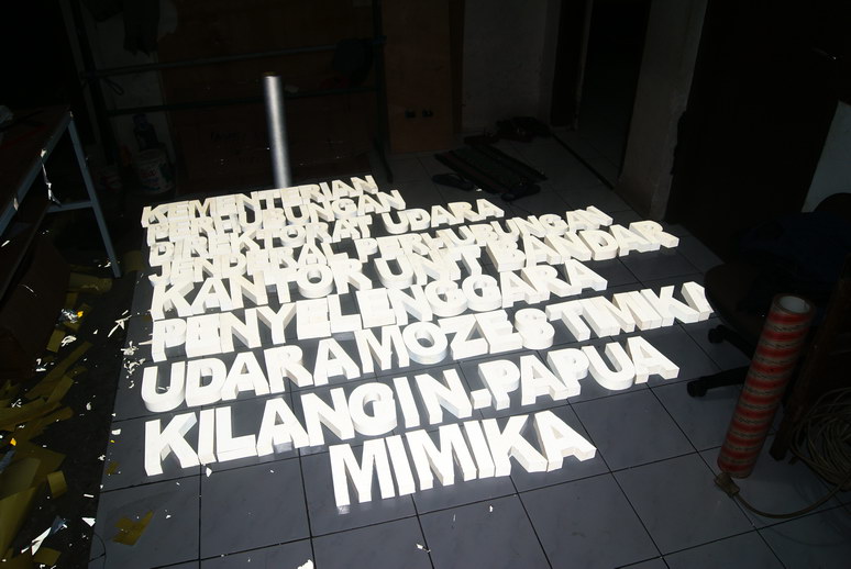 Huruf Timbul Stainless steel pakai stiker skotlite Kiwalite tampak malam Pesanan Kementerian Perhubungan Bandara Udara Mozes Kilangin Timika Mimika Papua.